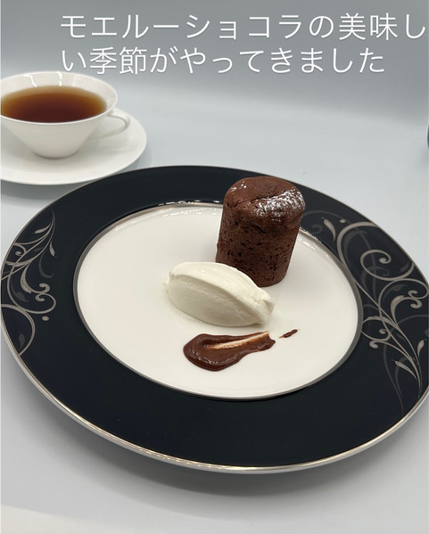 2025.11.14 お知らせ フランスのデザート焼きたてのモエルーショコラ Moelleux au chocolatフランスのデザート焼きたてのモエルーショコラ 生クリーム添え。紅茶付き。 ¥1500